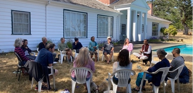 On Sunday, May 25th, from 3pm to 4:30pm, a dialogue with four participants and myself took place on the lush green grass outside the Main House near the swimming pool. It was a beautiful day with plenty of sunshine.